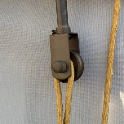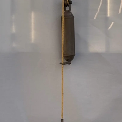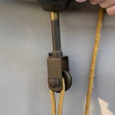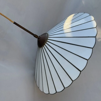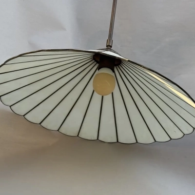 A rare pendant lamp from the 1970s with a sculpted milk-white opaline glass shade with geometric flourishes that combines Tiffany-style craftsmanship and Art Deco elegance. It is suspended from a counterweight and brass chain system and has height adjustment for optimal balance and adaptability. It looks great over dining tables, foyers, or lounges with a retro feel. The counterweight adds industrial intrigue, while the streamlined silhouette and soft, diffused glow evoke mid-century glamour.