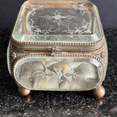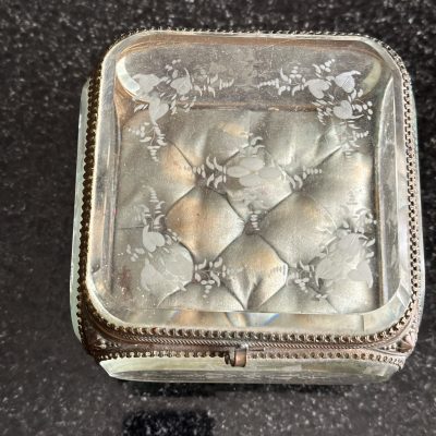Antique 19thc French bevelled glass reliquary or jewel box with intaglio engraving and gilt mount. Inside, a silk upholstered cushion in aquamarine silk. The lid and sides are engraved with columbines.