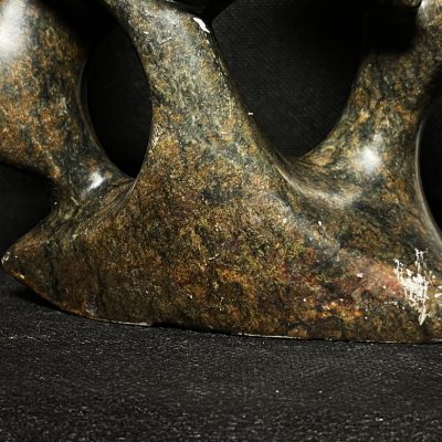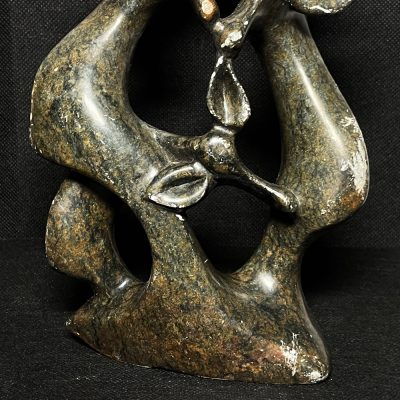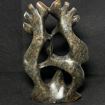 An impressive abstract sculpture of a giraffe family, all with elongated necks curving into a heart-shaped embrace, is entirely hand-carved from soapstone following the traditions of all Zimbabwean or Kenyan artisans. The fluid, organic forms are accentuated by the polished stone’s natural mottling, and subtle, branch-like protrusions suggest treetop grace along with ossicones. A smaller figure snuggles beneath. This completes the kinship narrative with a calf. Collectors of global art will adore this piece since it is a supremely serene accent in nature-inspired interiors; in addition to that, it is exceptionally smooth along with wonderfully stable as it artfully blends African wildlife reverence together with modernist abstraction.
