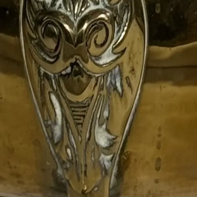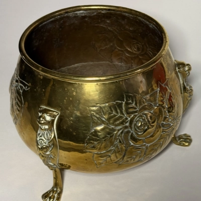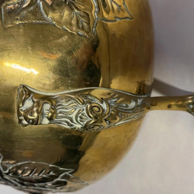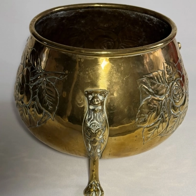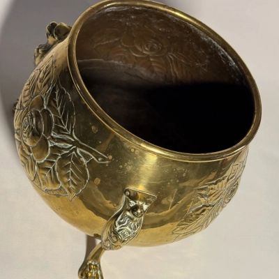 A. Raulin’s lavish brass planter from the late 19th century, which is a prime example of Dinant, Belgium’s renowned dinanderie craftsmanship. Stylized lion or dragon-head handles lend mythical grandeur, and the bowl-shaped body, flared at the rim, is embellished with elaborate embossed floral motifs, including a central rose blooming amid swirling leaves and stems. This piece, which rests on three claw feet, strikes a balance between Victorian opulence and Art Nouveau’s organic fluidity.