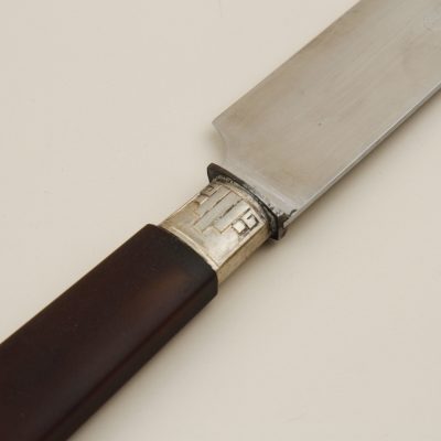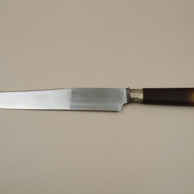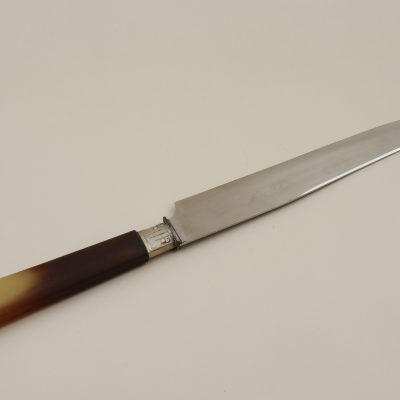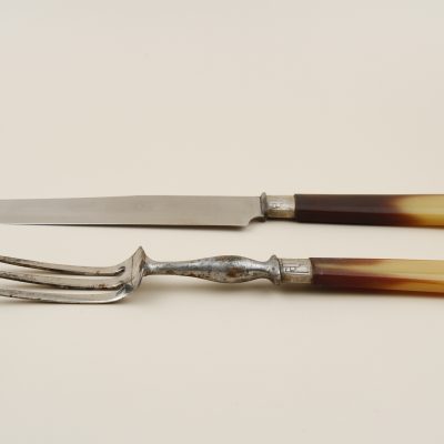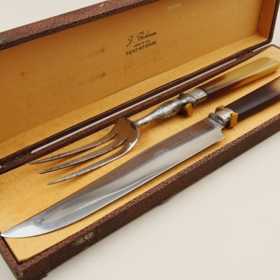 Distinguished carving service featuring polished bone handles with stainless steel mounts, circa 1900. This elegant two-piece set includes a carving knife and fork, housed in their original fitted presentation box. The quality of craftsmanship and refined presentation reflects the gracious dining customs of the Belle Époque.
