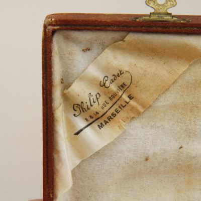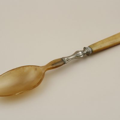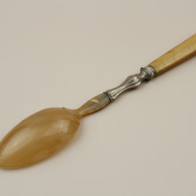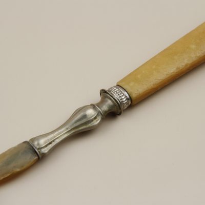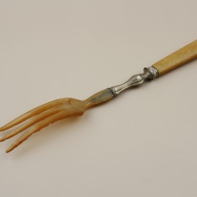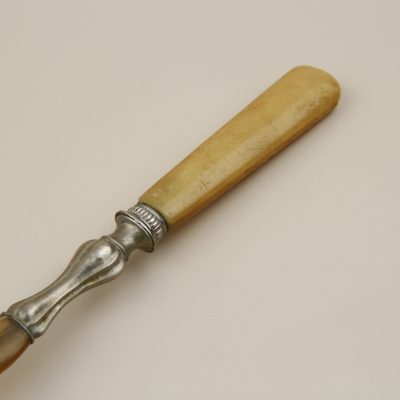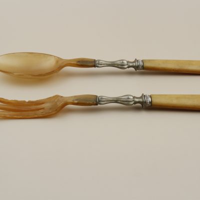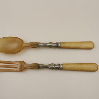 Nice Salad set with bone handles and mounts of silver-plate, ca.1900 This nice pair comprises a serving spoon and fork in their original fitted case. The pieces show beautiful period detailing in the mounts.