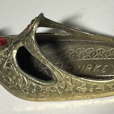 This unique, antique ashtray in the shape of a shoe combines utility and nostalgia. The delicate construction in brass showcases intricate details everywhere, from the texture on the laces to the curving of the sole, making it both an applied accessory and a conversation piece. In nice patina and solidly made, this should appeal either to the serious collector or as an interesting accent in any setting. Perfect for those who appreciate quirky, nostalgic items with a touch of elegance.
