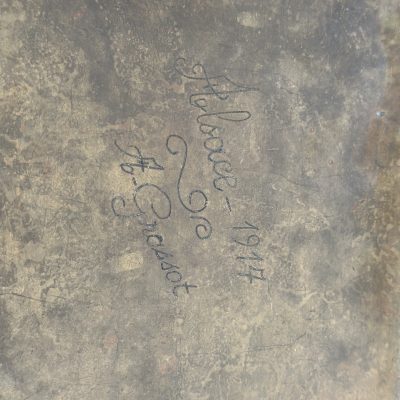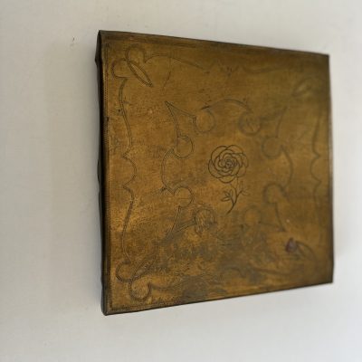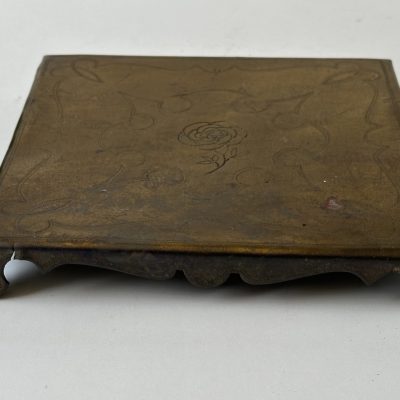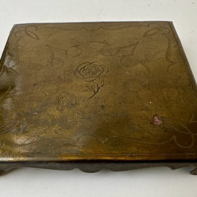 This antique brass trivet, from 1917, is an exceptionally well-made item with fine etchings and a very decorative design. Having small, raised legs and a flat surface, it would have been used functionally to place hot items on and protect surfaces, yet it was also a decoration in its own right. The ornate details and craftsmanship suggest that it was made with both practicality and artistry in mind.
