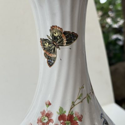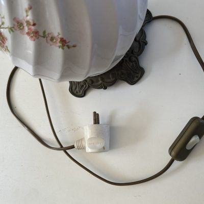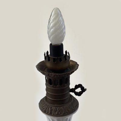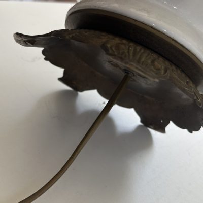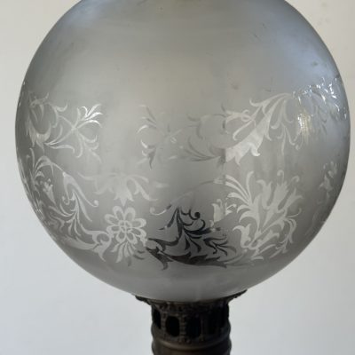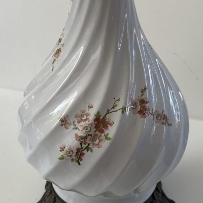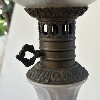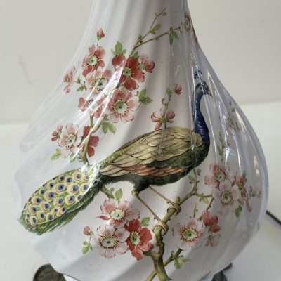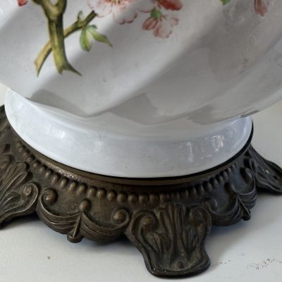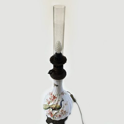 An magnificent oil lamp from the late 19th century that has been converted to electric power. It has a white porcelain body that has been hand-painted with a peacock and cherry blossom design. The frosted glass globe with etched floral designs, ribbed neck, and elaborate brass base all exhibit Asian-inspired artistry and Victorian elegance. This lamp, which combines practical design with Belle Époque opulence, is ideal for lending vintage charm to mantels or side tables.