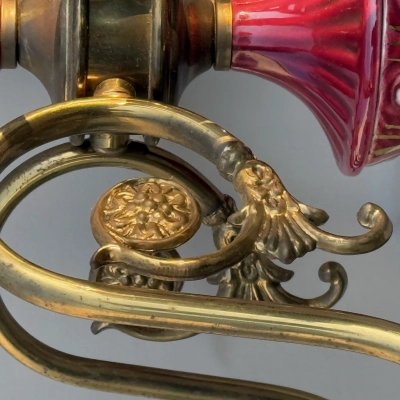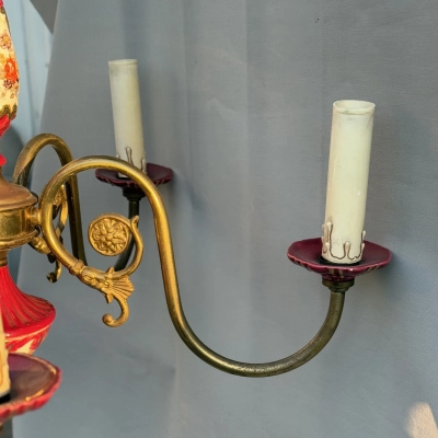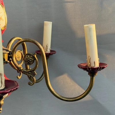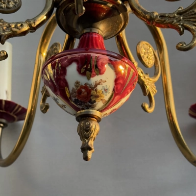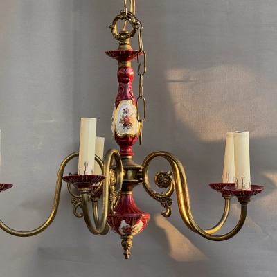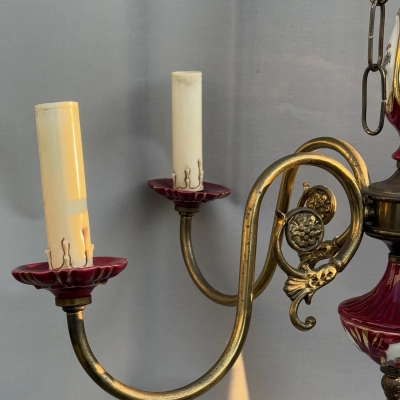 An elegant chandelier from the late 19th century that combines lavish brass craftsmanship with porcelain artistry. Four elegantly curved brass arms flow from the central stem, which is embellished with hand-painted floral medallions on white oval reserves and deep red porcelain. With elaborate scrollwork and gilded accents, the delicate glow of the cream candle tubes is accentuated by the crimson porcelain bobeche (drip pan) where each arm ends.