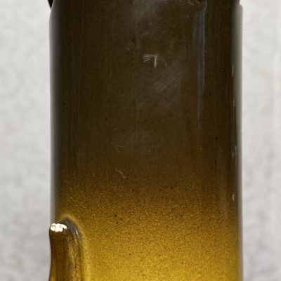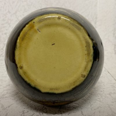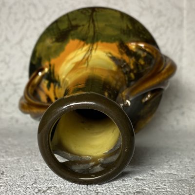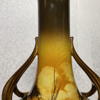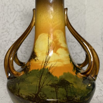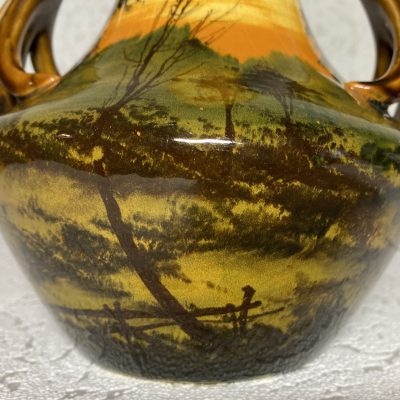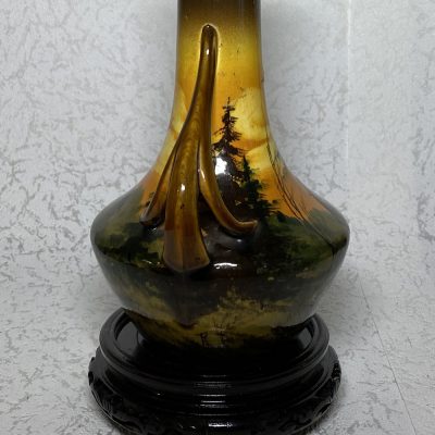 This is a beautiful antique vase with an elegant, hand-painted depiction of a serene landscape, complete with a traditional house nestled amidst natural beauty. Rich amber tones blend into the intricate brushstrokes, creating a warm and inviting aesthetic.