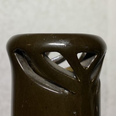 Delicately arched handles create an artistic flair in this vase’s design, which it confidently sits on a carved wood base, accentuating its timelessness. This is simply a perfect centerpiece or a collectible that merges beauty and skill.