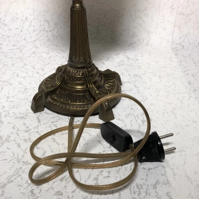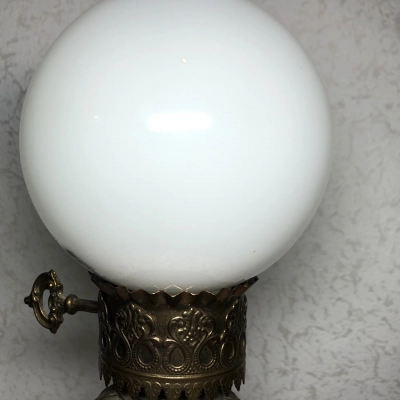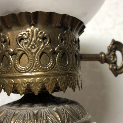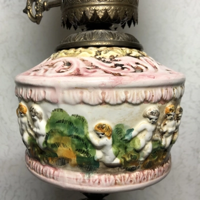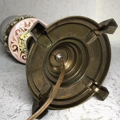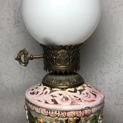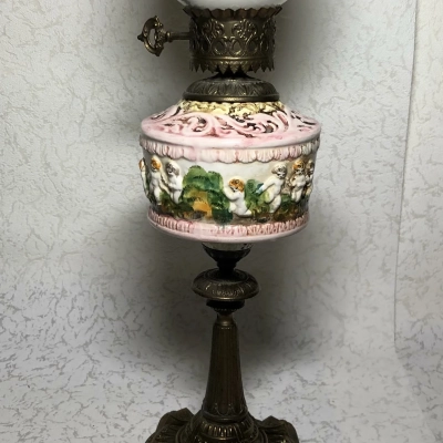 This 19th-century table lamp combines romantic artistry with neoclassical elegance. The porcelain body has a bronze crown-like finial and pink scrollwork bands surrounding the raised cherubs amid the green foliage. Warm light is dispersed by a white milk glass globe, and its grandeur is stabilized by an elaborate bronze base with curved feet. Described in Dutch as “porcelain, glass, and bronze,” this lamp epitomizes the splendor of the Regency era and would look great on mantels, in libraries, or as the focal point of a collector’s room.