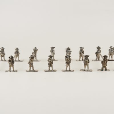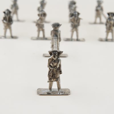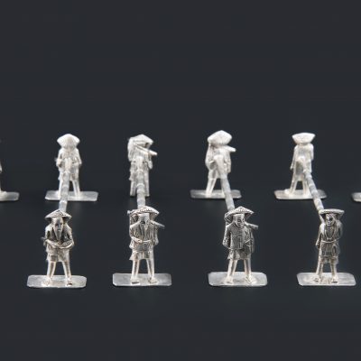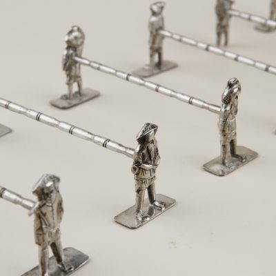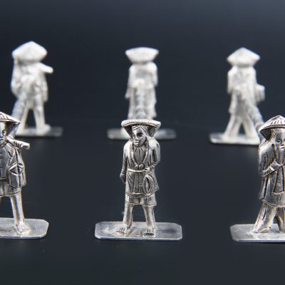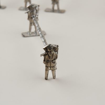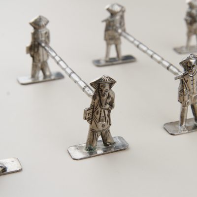 Antique set of 8 silver-plated Asian knife rests dating back to the early 20 century. Asian labourers all depicted very detailed and different held together by a bamboo looking branch.