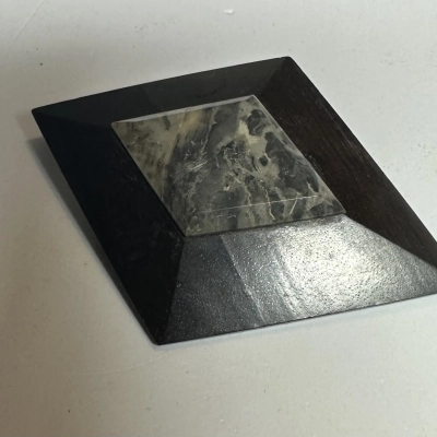 Art deco diamond shaped wood and blue gemstone brooch. From the brand: culture mix