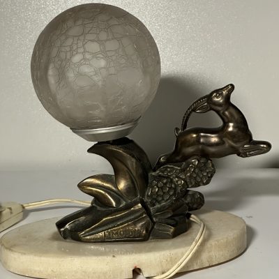 The base of the lamp is in a well-designed bronze sculpture featuring an oryx in leap-an absolutely dynamic movement in air with a touch of high-brow sophistication. The sleekness of the glass and the intricacies of the bronze piece produces a timeless and elegant statement piece to any room. Perfect for collectors or anyone who has an interest in Art Deco design.