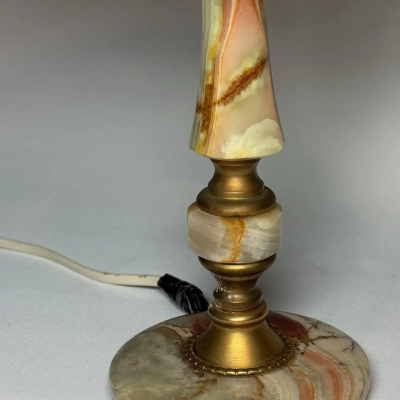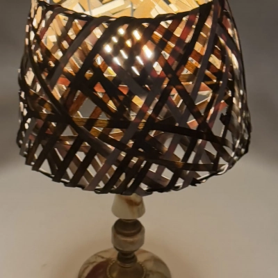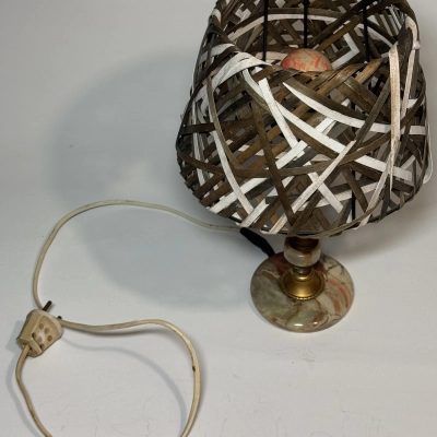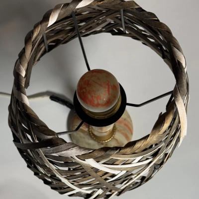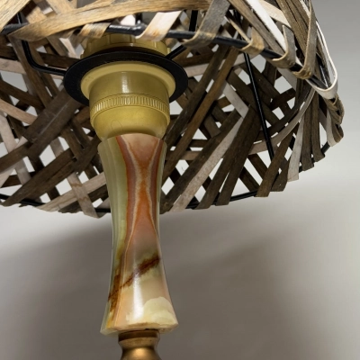 With its dark and pale bamboo strips interlaced like sunbeams through a forest canopy, the woven wood shade of his lamp dances with shadow and glow. The piece is rooted in the artistic creation of nature by the swirling marble base below, which is adorned with rust veins and earthy creams. The organic color of the shade is echoed by the creamy surfaces of the brass fittings that shine between the segments of onyx stone. The weave creates delicate patterns when illuminated, turning walls into dappled light canvases. Beautiful combination of stone, wood, and metal.