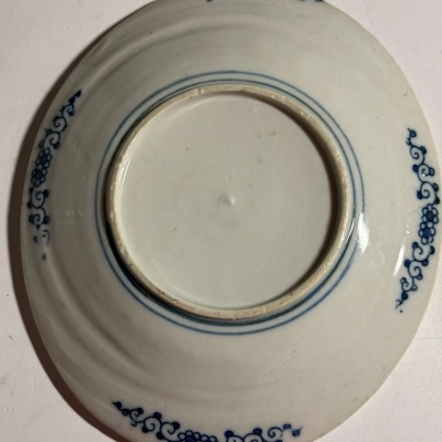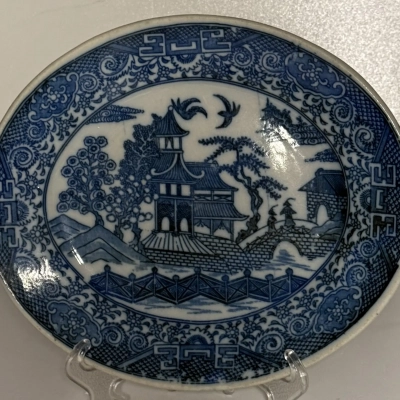 A traditional ceramic plate with the recognizable Willow design that showcases a peaceful landscape with arched bridges, pagodas, and birds that are reminiscent of China. It is hand-painted in cobalt blue and white with a border of floral designs. Perfect for collectors of vintage transferware or as a classic wall accent