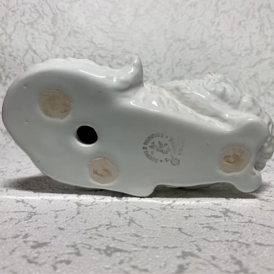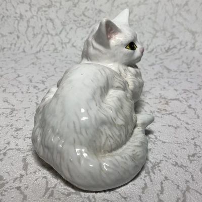 This adorable porcelain sculpture, which was made by the well-known Portuguese company Bordallo Pinheiro, shows a white cat lying down. The delicate sculpture captures the elegant curves of the cat’s body as it is at rest, showcasing detailed intricacies.