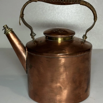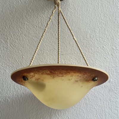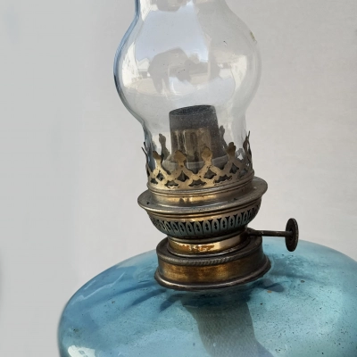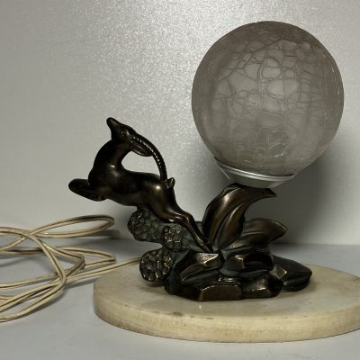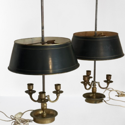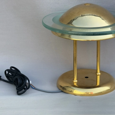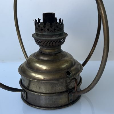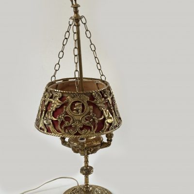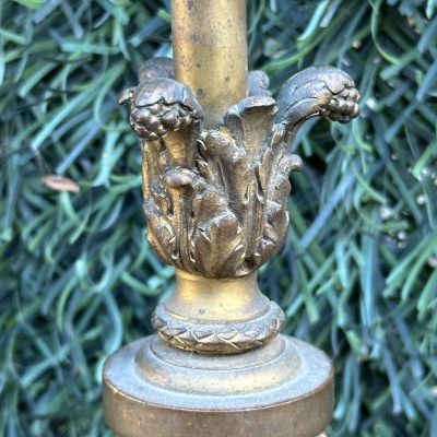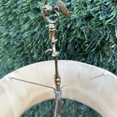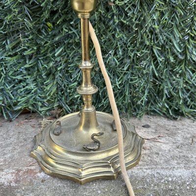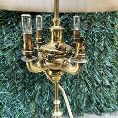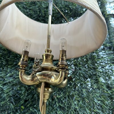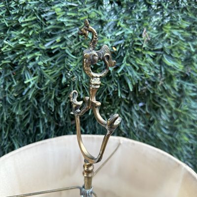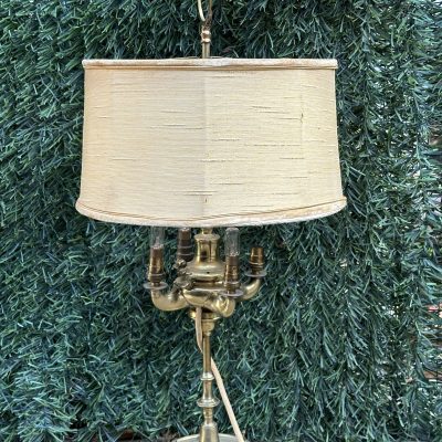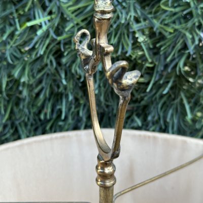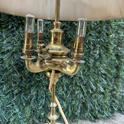 A pretty brass table lamp from the early 20th century, probably a converted gas fixture, with a textured cream silk shade and four sconce-style arms with clear glass chimneys. The brass finial lends a touch of refinement, and the S-shaped stem and elaborate base with decorative edging display Art Nouveau influences. Combining historic craftsmanship with practical design, this lamp is ideal for adding vintage warmth to desks or side tables.