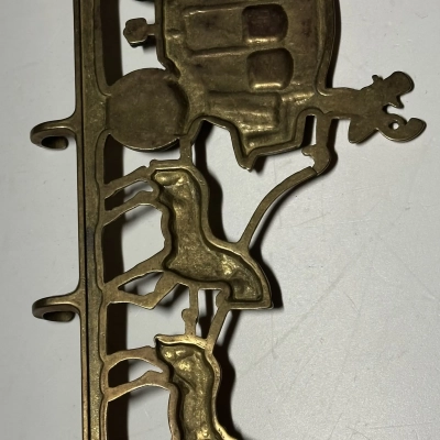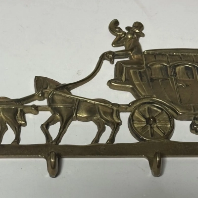Featuring a detailed scene of a carriage, two horses, and a horseman wearing a top hat blowing a horn, this brass key holder will add a touch of vintage charm to your home. Crafted from the 1970s to the 1990s, this piece exhibits classic functionality and craftsmanship.
