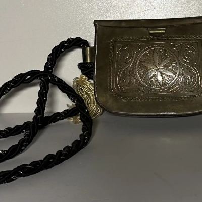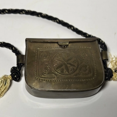 With its striking, geometric form, this one-of-a-kind vintage brass pillow purse clutch embodies Art Deco elegance. The handbag’s sleek brass exterior and eye-catching black rope strap with ornamental tassels strike the ideal mix of style and sophistication.