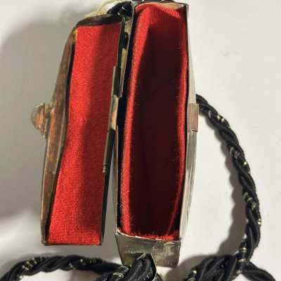 This item, which is both small and practical, is perfect for carrying necessities and making a striking fashion statement. It is an exceptional addition to any vintage or Art Deco-inspired collection because of its classic design and fine craftsmanship. Excellent as a collectible display item or for evening occasions.