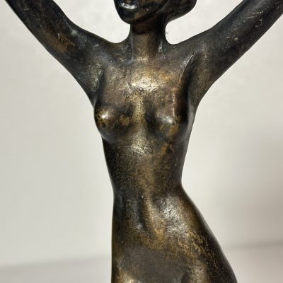 This is a bronze statue of a nude female figure in a sensual, contemplative pose. The figure stands contrapposto, one arm raised to the head, which provides an elegant, fluid silhouette. The body is modelled naturalistically, capturing the fall of curves and contours across the female form. A warm, richly textured patina has developed over the surface of the bronze, adding depth and character to the sculpture. Overall, the pose and medium used to create this piece give it a sense of grace, beauty, and introspection.