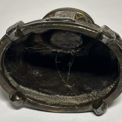This serene Buddha is seated on a pedestal of lotus leaves, holding in his lap a small bowl designed to burn incense. The inside of the sculpture is hollow, standing on four feet, with Japanese characters beneath the bowl. The back reads, “Made in Japan,” furthering its authenticity. This piece of work contains spiritual symbolism combined with utility, hence it will add to the quietness of any place; it is for those who appreciate art and meditation.
