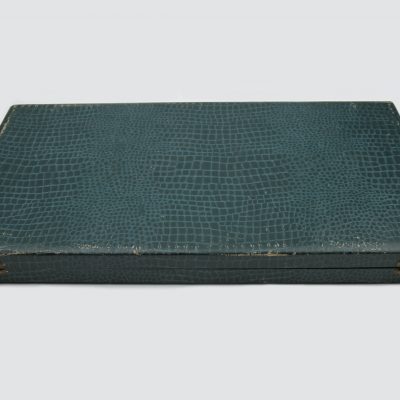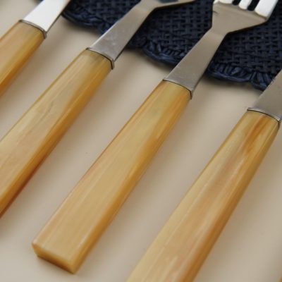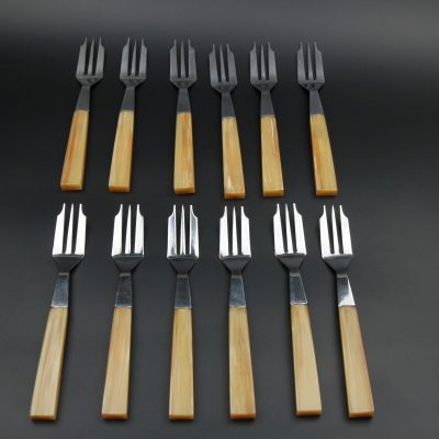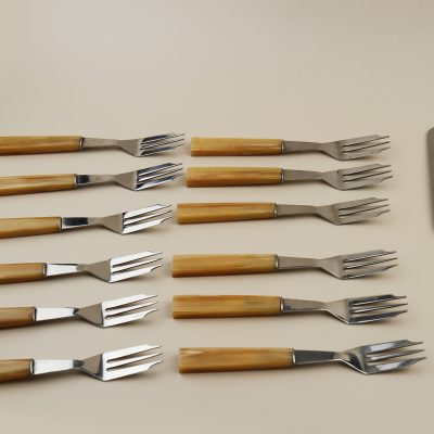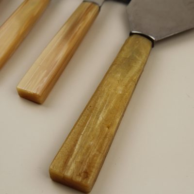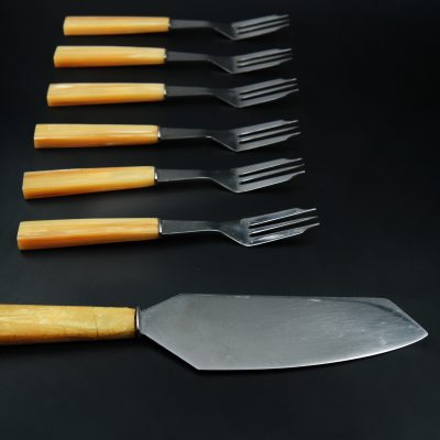 Elegant cake cutlery in a velvet-lined presentation box. The set includes a cake knife, along with a number of smaller forks and other tools, each rendered in a sleek, refined style. The pieces look solidly built, ready for serving and enjoying gourmet desserts. The enclosed case allows one to store and display the cutlery set in a considerate and elegant manner.