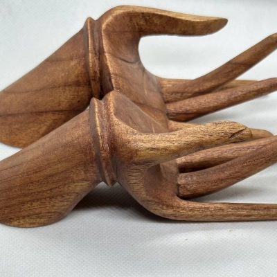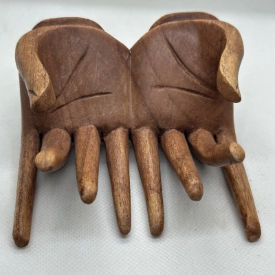 These carved wooden hands have rich, aged patina and their fingers are articulated. They can be used as useful containers for jewelry, book or cardholders, as decorative items, as unusual wall hooks, or even as glove stretchers.