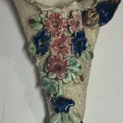 An adorable triangular ceramic wall pocket featuring pink, blue, and green floral motifs and a ruffled top. Its vintage appeal is emphasized by the glazed finish and textured, sanded background. features a display hanging hole. Ideal for giving any room a dash of vintage charm