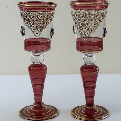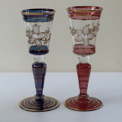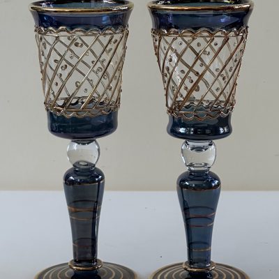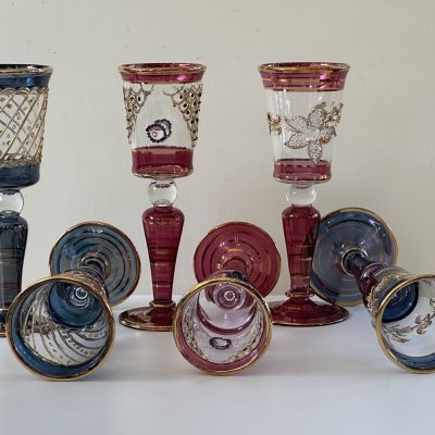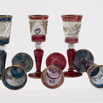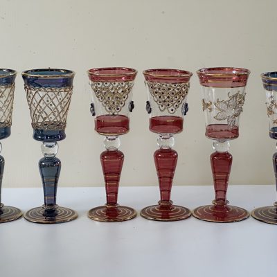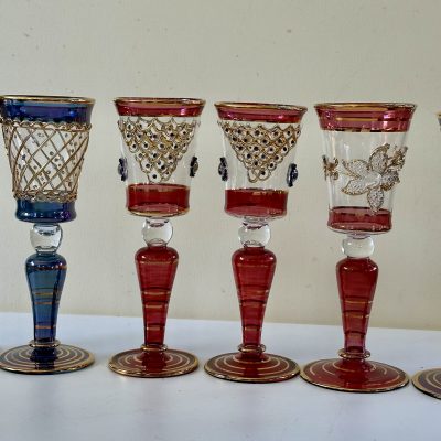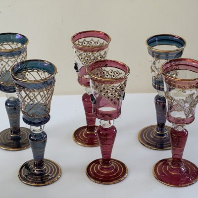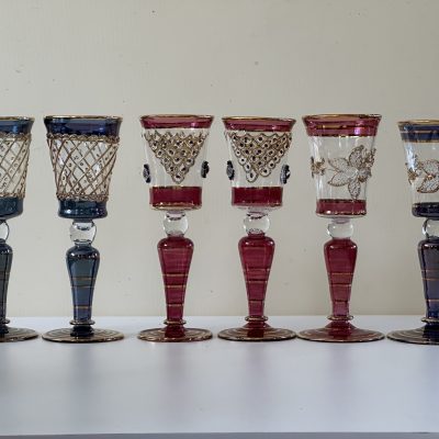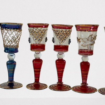 6 thin crystal glasses, with hand decorated in pure gold in 6 different colors. Crafted in Italy by expert craftsmen