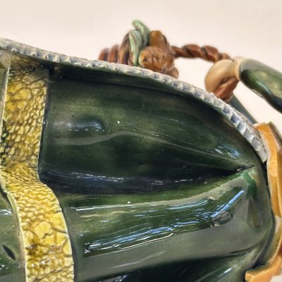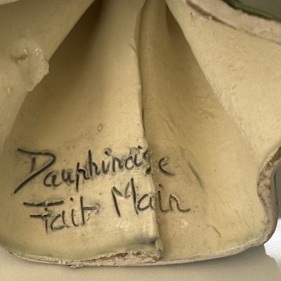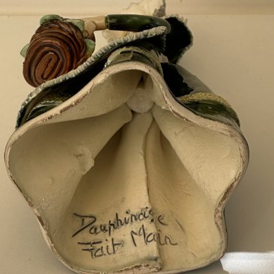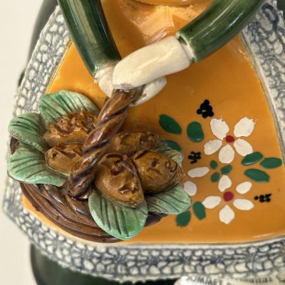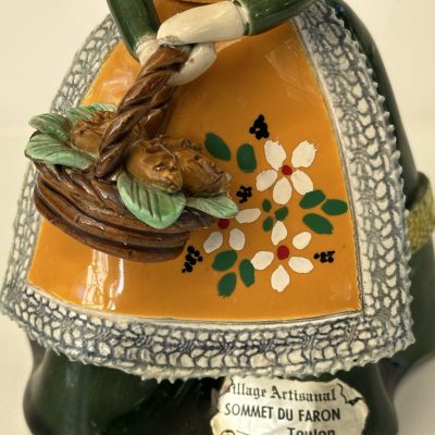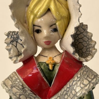 Delightful decorative bell featuring an elegantly attired Victorian-style figure in vibrant red, green, and gold tones. This charming collectible features exquisite hand-painted detail, from the delicate lace trim to the beautiful floral accents on her dress. The piece demonstrates fine craftsmanship with its dimensional design and intricate painted embellishments.