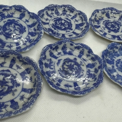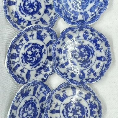 Six coordinating Chinese blue-and-white porcelain plates with a scalloped border and a central medallion encircled by figural vignettes. The consistent patterns, which are painted in cobalt underglaze, feature academics, landscapes, and floral motifs that are common in export goods from the 18th and 19th centuries. Perfect as a striking table setting or for collectors of ceramics from the Qing Dynasty.