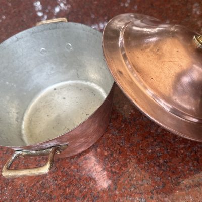 Classic in design, with a warm patina, this casserole dish is functional in the kitchen but also decoratively appealing for a rustic or traditional interior. Perfect for collectors, chefs, or anyone who loves antique kitchenware with character.