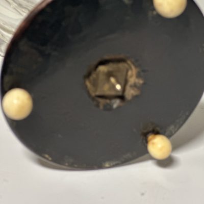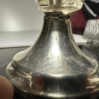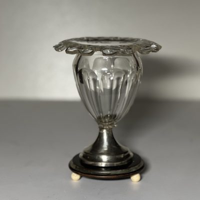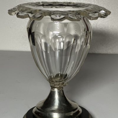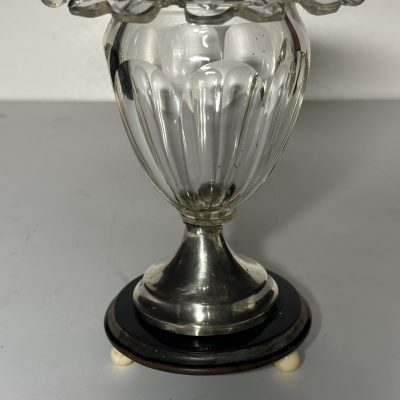 Cut crystal dessert cup with olive or almond cut with folded edge, ø 15 cm on round silver, 835/000, foot with pearl edge. ø 7 cm. Height 13 cm. MT: J.Hogendoorn, Amsterdam ca 1885