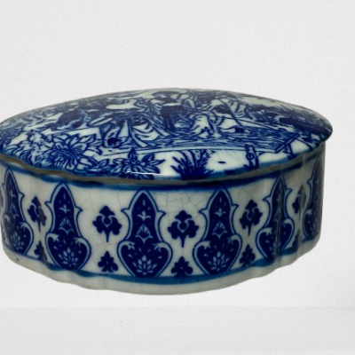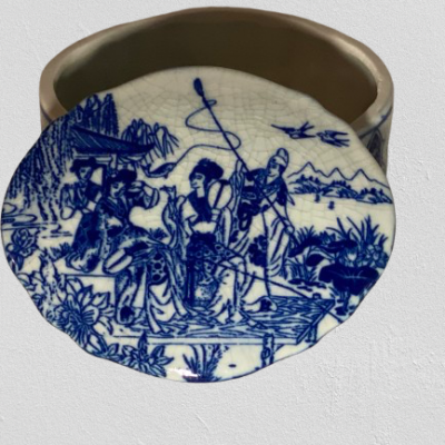 Beautiful hand painted ceramic bonbonnière from the famous Dutch ceramics factory De Porceleyne Fles. It is signed unknown which painter and the year code seems CV from 1976, De Porceleyne Fles, the “JT” refers to “Joost Thooft,” a significant figure in the factory’s history. Let me know if you’d like more info about this hallmark or its origin At the bottom complete with sticker from the factory and where it was sold ten Holder Assen Emmen. It is in very good condition. Dimensions: 16 cm diameter and 8 cm high.