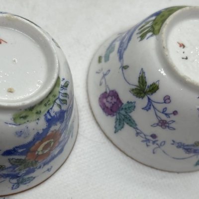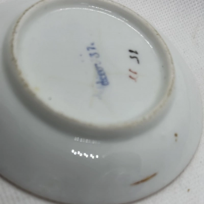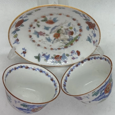 One saucer and two cups make up this Chinese-inspired tea set from Mosa Porcelain & Brick Factory in Maastricht, Netherlands (c. 1900). Finished with a smooth rust-edged rim and adorned with cobalt-blue scrolls that frame floral sprays with ochre tones. Europe’s early 20th-century interest in Asian aesthetics is reflected in the fusion of Dutch Art Nouveau flair with Qing Dynasty motifs. marked with the trademark of the Mosa factory. Perfect for those who collect Art Nouveau tableware or Sino-Dutch ceramics. The saucer has a chip.