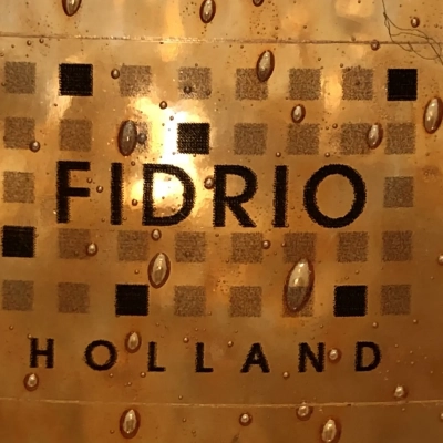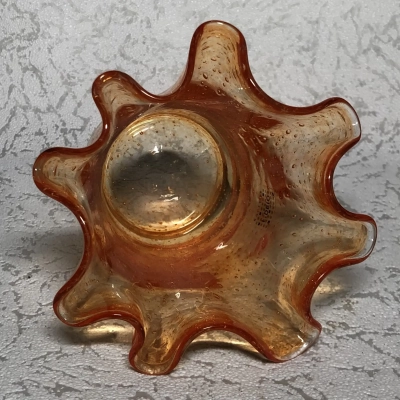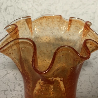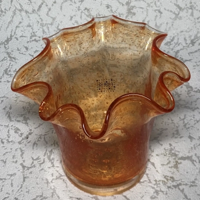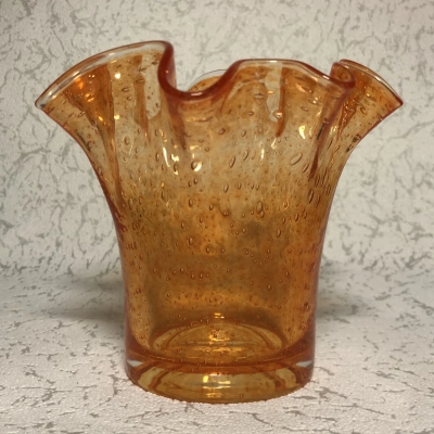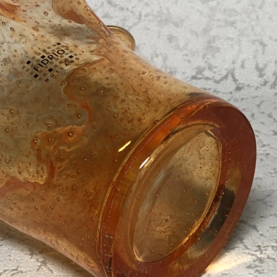 At the top of its gently upward-flaring cylindrical form is a rippled rim that resembles wind-tossed water. Thousands of tiny bubbles swirl in the glass, frozen mid-float, as the warm orange color intensifies as it moves toward the bottom. An example of artisanal craftsmanship that combines practicality and whimsical sculpture is the Fidrio logo, which is etched below and anchors its Dutch heritage.