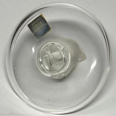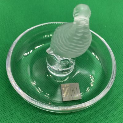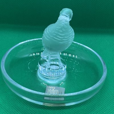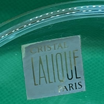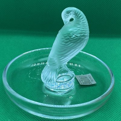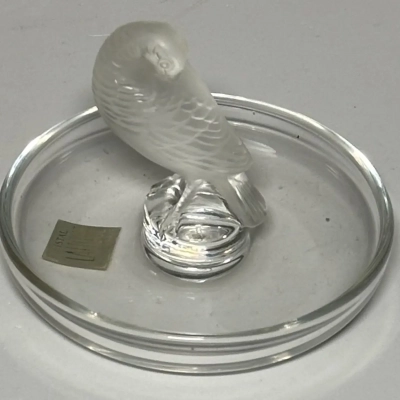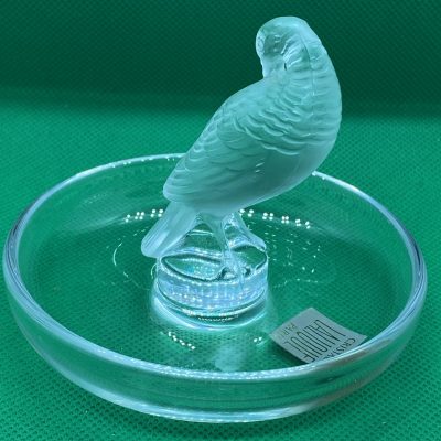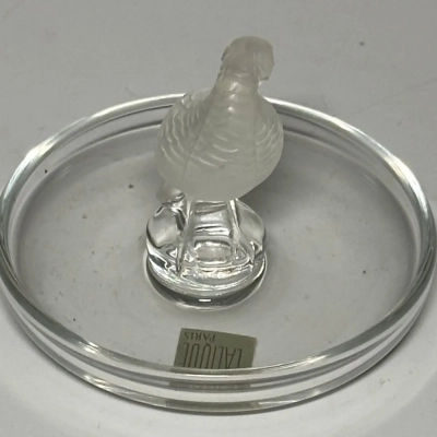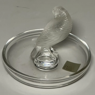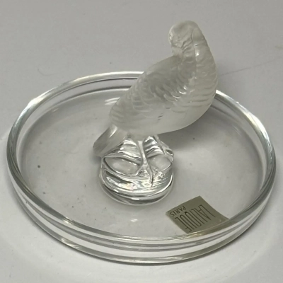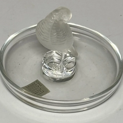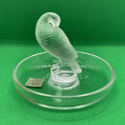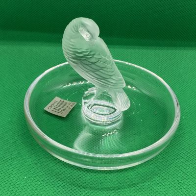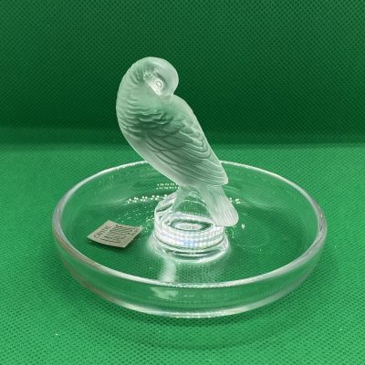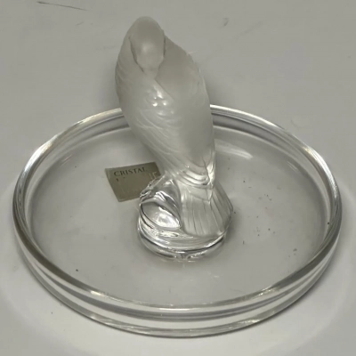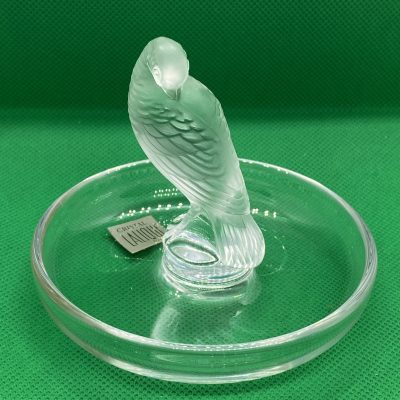 The circular base serves as a versatile tray, making this not only a beautiful decorative item but also a functional ring dish or trinket holder. Perfect as a gift or a statement piece for any collection. This Lalique design captures the artistry and sophistication of fine crystal work.