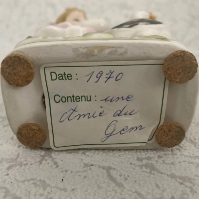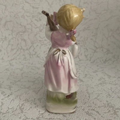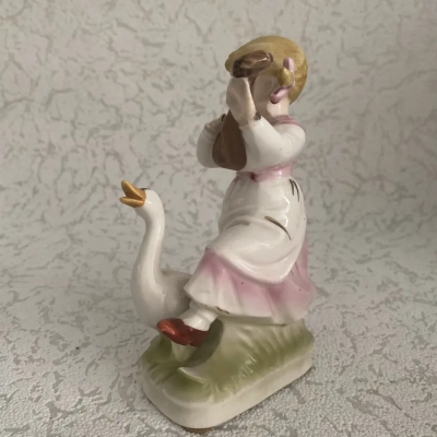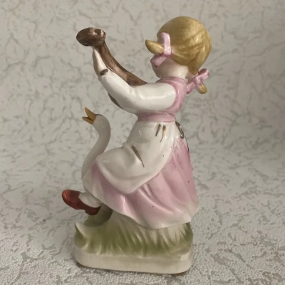 This charming 1970s vintage porcelain figure shows a little girl playing with a lively goose while wearing a tiered cream dress with pink accents. Pink ribbons are used to arrange her golden hair, which lends a charming and innocent touch. The figurine’s pastoral attractiveness is further enhanced by its delicate hand-painted features and green base with realistic accents. A beautiful example of the beloved decorative figurines that were popular in mid-century home décor is this amusing item.