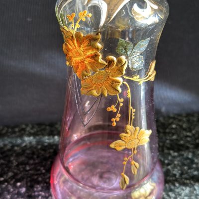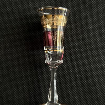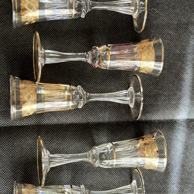 This exquisite vintage glass decanter set includes a beautifully crafted decanter with a stopper and six matching glasses. Each piece features intricate gold detailing and a delicate design, perfect for serving liqueurs, spirits, or special beverages. The decanter has an ornate charm, making it an ideal centerpiece for any home bar or dining table. A timeless addition to your collection or a thoughtful gift for lovers of vintage elegance. 6 stemmed gilded glasses in pastel color 1950s / 60s