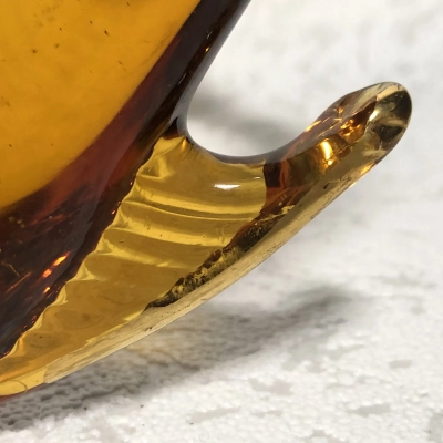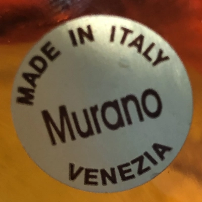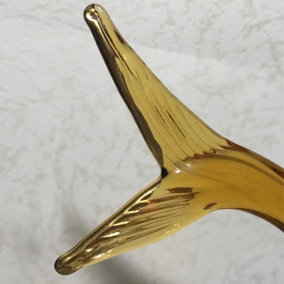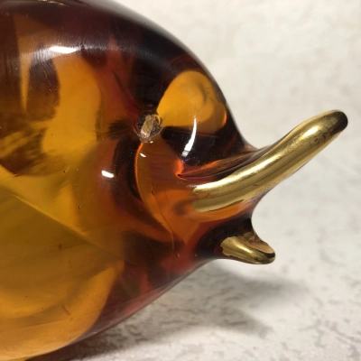 This classy glass fish sculpture is made of deep amber or honey-colored glass that has been fashioned to resemble a stylized tropical fish. The piece’s pointed facial features, upturned tail fin, and flowing curves all showcase expert glasswork. Light is caught and warmly diffused by the translucent amber glass, and delicately sculpted details allude to body contours and fins. Despite being influenced by Murano techniques, the design exhibits the modernist, simplified style typical of decorative glass art from the mid-century. Murano. Marked by sticker.