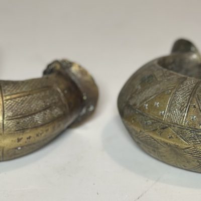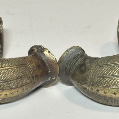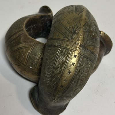 These impressive bronze bracelet date back to the early 20th century, in good condition, with a strong design featuring a maximum diameter of 9.6 cm and an inner diameter of 6.8 cm, weighing an astonishing 600 grams a piece. Crafted with strength, but also with purpose, these bracelets were not meant for just wearing; instead traditionally used by the Gurma people, an ethnic group from northeastern Ghana through Burkina Faso and surrounding areas, they were believed to have medicinal properties, especially against rheumatism and arthritis. This pair represents a part of cultural heritage and a link back to medical practices of old; it shows a cross-section of art, tradition, and wellness in the Gurma community.