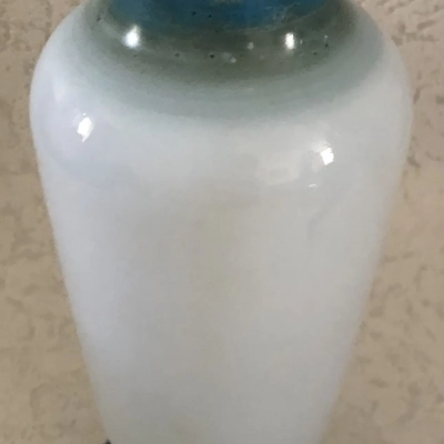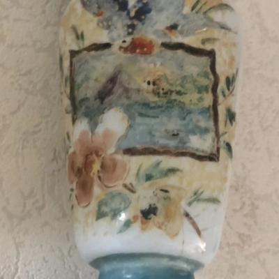 This is a cream-colored art opaline glass vase with gentle ocean blue borders. Dreamy, watercolor-like landscapes are painted on its curved shape. A lone blue bird perched above faded florals frame a central scene that combines blues and greens into abstract shorelines or misty hills. The impressionistic strokes of the earthy brown blossoms and muted ochre leaves that envelop the body allude to both Asian ceramic traditions and Art Nouveau fluidity.