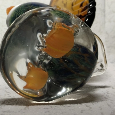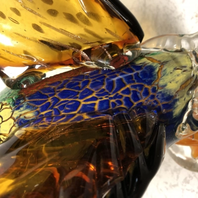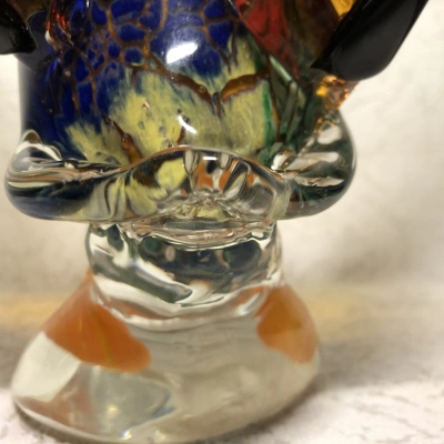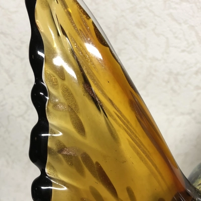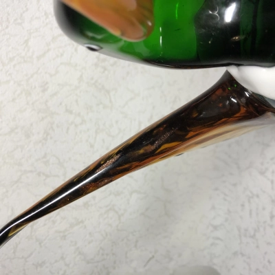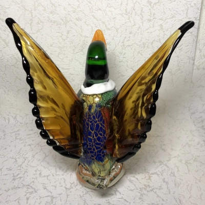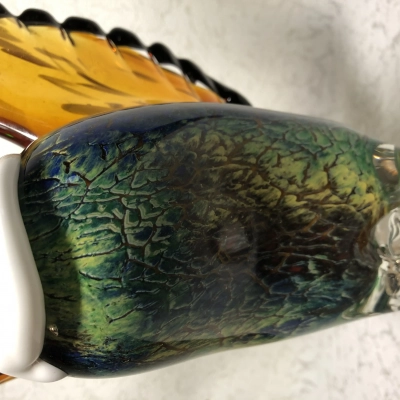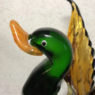 The vibrant beauty of nature is captured in swirling hues by this lifelike glass mallard duck. In addition to its iridescent blue-green “scales,” the mallard’s distinctive white neck ring highlights the deep emerald greens that shimmer on its body. The orange feet and beak stand out against a clear glass base, and amber-tinted wings with a black border extend upward as though in mid-flight. Expert glassblowing techniques are displayed in the fine details, such as the feather textures and the white-and-black eyes. This mid-century figurine, which combines art and craftsmanship, is a brilliant homage to wildlife.