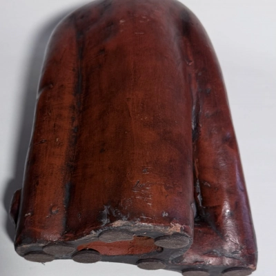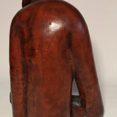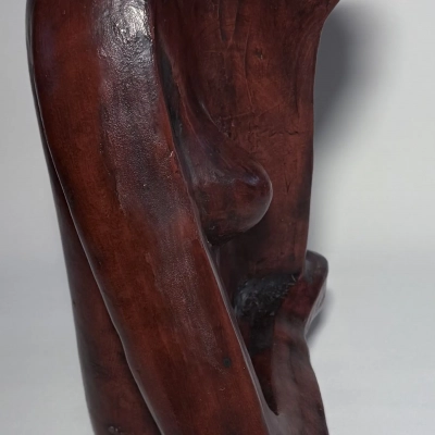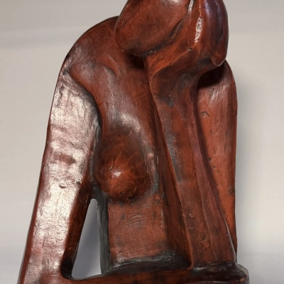 Carved from rich reddish-brown hardwood, this thoughtful sitting female figure epitomizes Moore’s lifelong interest in the emotive potential of the human form. The polished surface and flowing curves respect the warmth and natural grain of wood, while her rounded, monolithic silhouette—head bowed, arms enveloping the torso—echoes themes of introspection and maternal protection found in his later bronzes. See the article along the pictures.