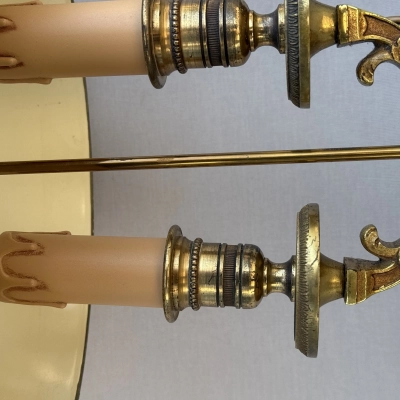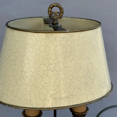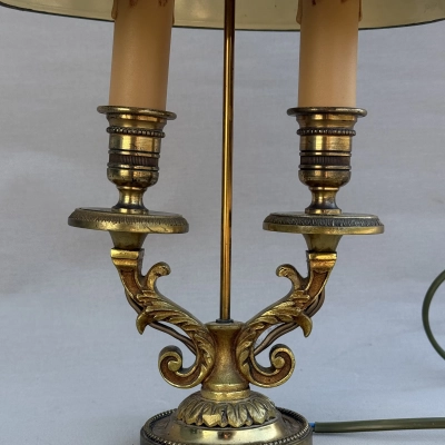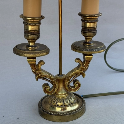 A sophisticated French bronze table lamp in the Louis XVI neoclassical style, with a brass-edged ivory fabric shade and twin curved candle arms adorned with acanthus leaf motifs. Ideal for mantels or formal interiors, the symmetrical design, gilt patina, and fine craftsmanship evoke 18th-century elegance.