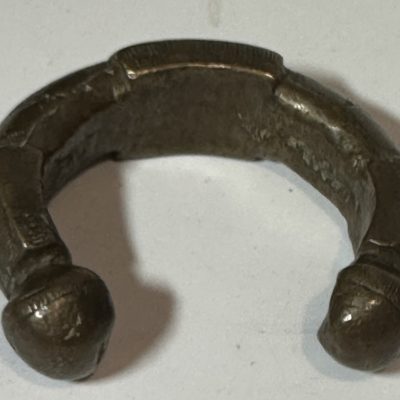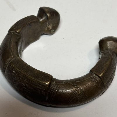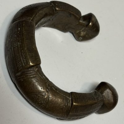 This bracelet, made of one piece of brass, represents an authentic Manilla-a traditional form of currency in West Africa from 1505 to 1940. Its curbed shape and smooth, polished surface indicate the cultural and economic significance it once had. The Manilla was used mainly for trading and symbolized one’s wealth and status. The open ends and slightly tapered edges of this bracelet testify to the skills and craftsmanship of African artisans who created these pieces for everyday use as functional currency, but at the same time as ornamental objects. A powerful symbol of Nigerian heritage, this Manilla bracelet carries a rich history-a history that captures the interaction between art, trade, and culture in pre-colonial West Africa.