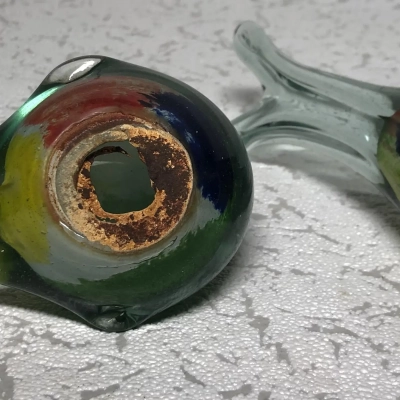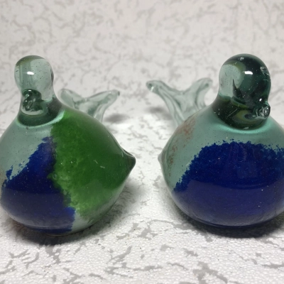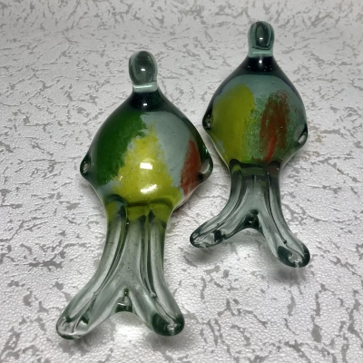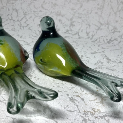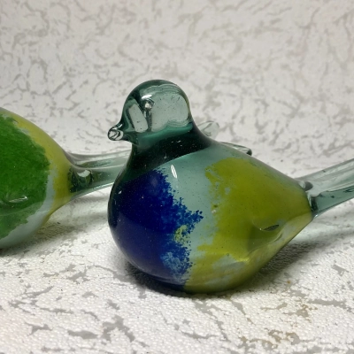 These decorative glass birds, which have a remarkable swirling of green, blue, and yellow colors throughout their bodies, demonstrate the distinctive techniques of Venetian-inspired glasswork. In order to illustrate the sommerso technique, which involves encasing various colored glass layers within clear glass. The fluid, organic quality attained through expert glassblowing is captured in these meticulously crafted figures.
