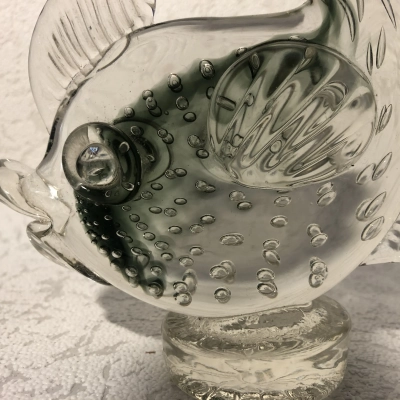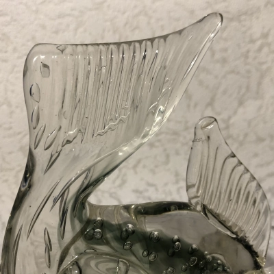 A small decorative glass fish sculpture with a traditional smoky grey tone. The abstract goldfish has a unique controlled bubble detailing in the body and a beautiful ribbed pattern along its fins. In traditional glassmaking, this design element is called “bullicante.” This lovely ornamental item exemplifies the elegant design common to decorative glass from the mid-century.