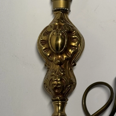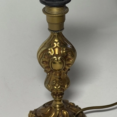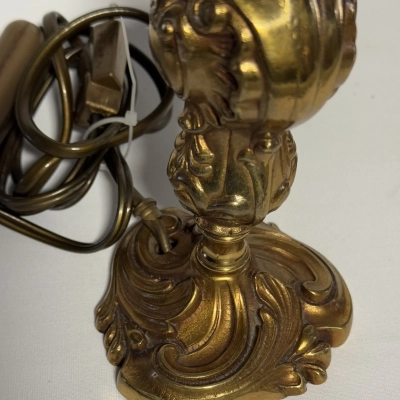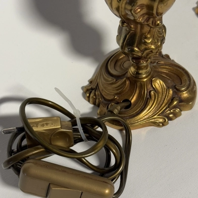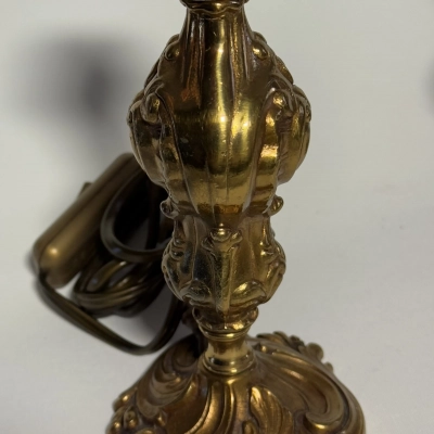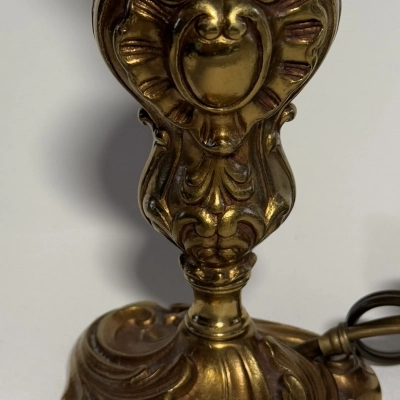 A set of identical antique brass lamp bases that exude luxury with a nod to Rococo design. Their bulbous bodies feature embossed medallions and acanthus leaves, and their curving feet serve as an anchor for the opulent design, which is cast in elaborate scrollwork and floral motifs. The warm patina of polished brass suggests decades of use, and threaded sockets at the top wait for the shades to finish changing the surface. Their Baroque drama—ornate shields, twisting vines, and theatrical proportions—evokes candlelit salons of the 18th century, despite being electrified for modern function.