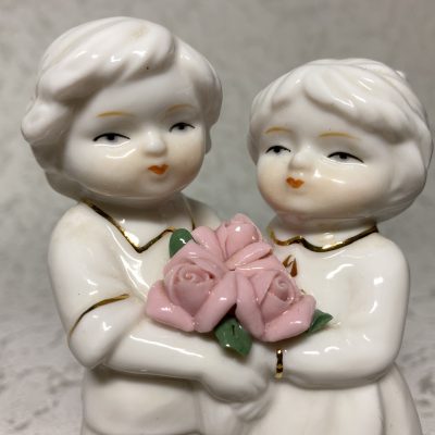 Vintage 1990s PMI white porcelain bride and groom figurine representing very nostalgic kitsch charm as one of the ultimate wedding décor collectibles. Delicately crafted ceramic statuettes symbolizing marital union were typical of mid-late 20th-century decorative porcelain collections.